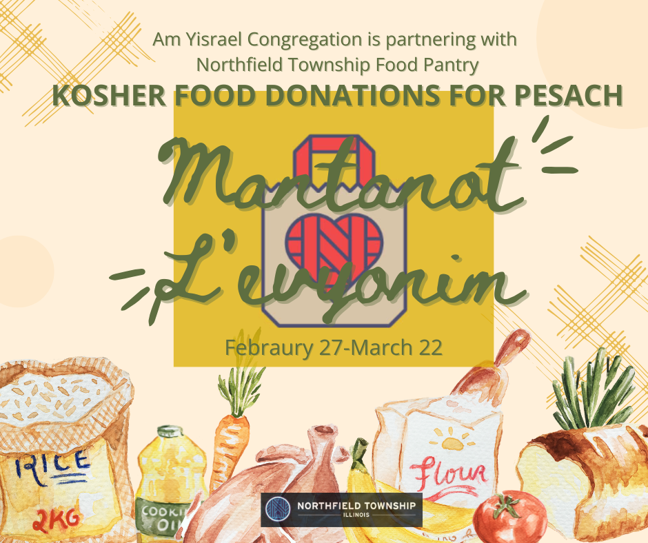 This Purim and Pesach season we are collecting kosher food donations in partnership with the Northfield Township Food Pantry. Please consider making a donation in the spirit of Matanot L’evyonim–one of the Commandments of Purim.